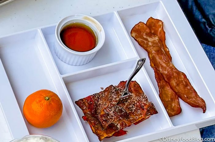 Sticking with the sweet treats, we decided to test out the kids’ entree next, the Cinna-Pym Mini Toast. We really enjoyed the French toast element (more on that in a minute), but we were definitely NOT fans of the turkey bacon. It was cold, which in our opinion, is not the best way to eat bacon. (Turkey or otherwise.)