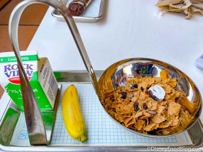 While the Spoonful of Cereal is served in a really neat gigantic spoon, in the end, it’s just your basic bowl of raisin bran. The menu describes it as bran flakes and raisins, garnished with yogurt-covered pretzels, served with whole milk and a ripe banana. Unless raisin bran is your favorite food in the whole wide world and it’s what you have for breakfast every day…we’d probably recommend picking something a bit more exciting. And we suggest pouring your milk in slowly, we found that we didn’t need it all.