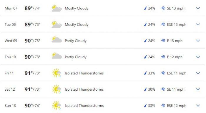 Here is a full overview of the week according to The Weather Channel. Temperatures are projected to hang out in about the same place for the whole week. We’re looking at a range of 80s to 90s highs and 70s lows.