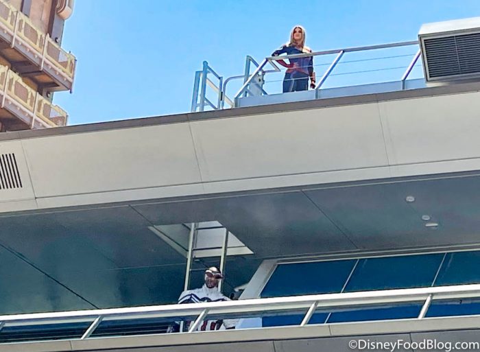 And nearby, Captain Marvel was keeping watch over Avengers Campus!