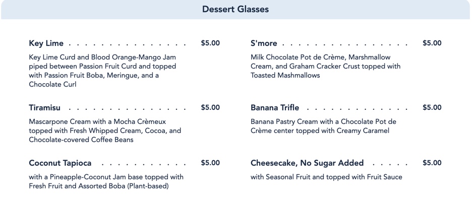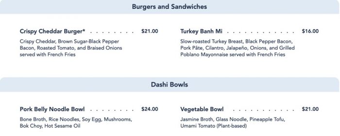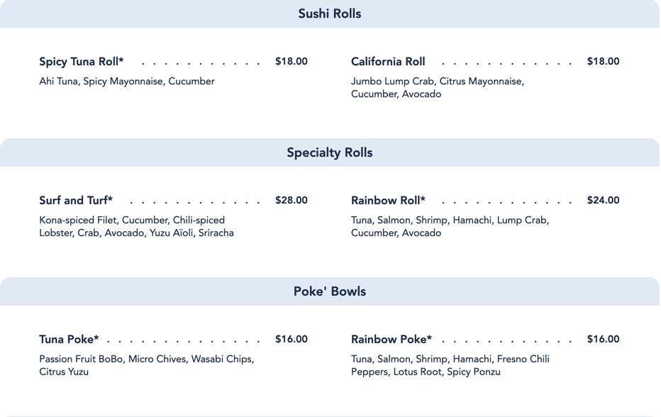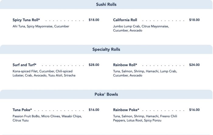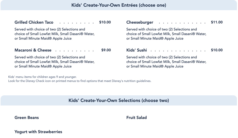 …and the Kids’ Menu! This still features arguably one of the COOLEST kids meals in all of Disney World — Kids’ Sushi featuring CHICKEN NUGGET SUSHI. It’s as cool as it sounds!