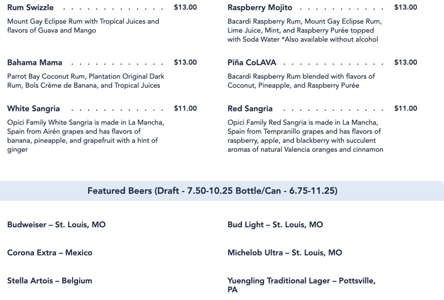 The drink menu is loooong here, compared to most sit down restaurants on property. This spot has a wide selection of unique beers as well.