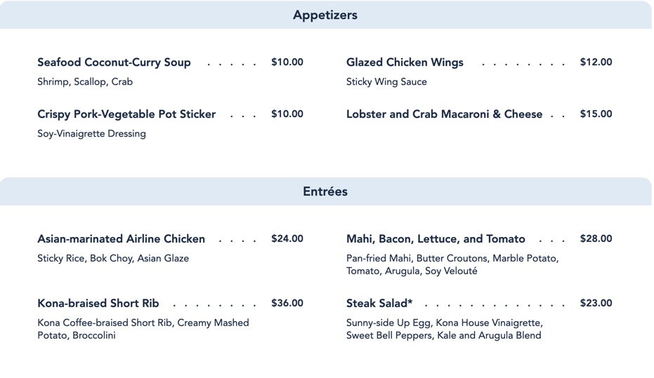 …Appetizers and Entrees (at lunch you won’t find the Lobster Mac and the Airline Chicken. You will find a story fry option though…