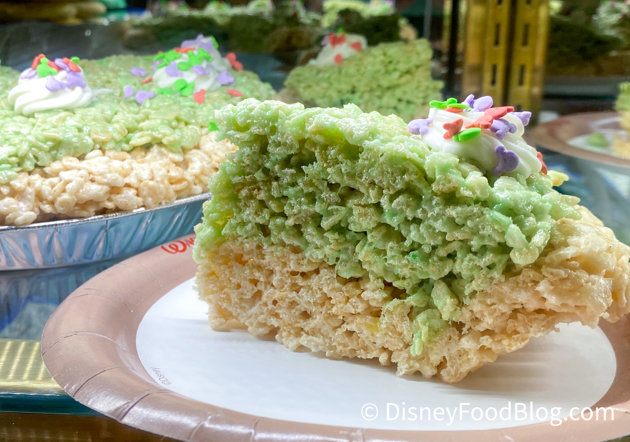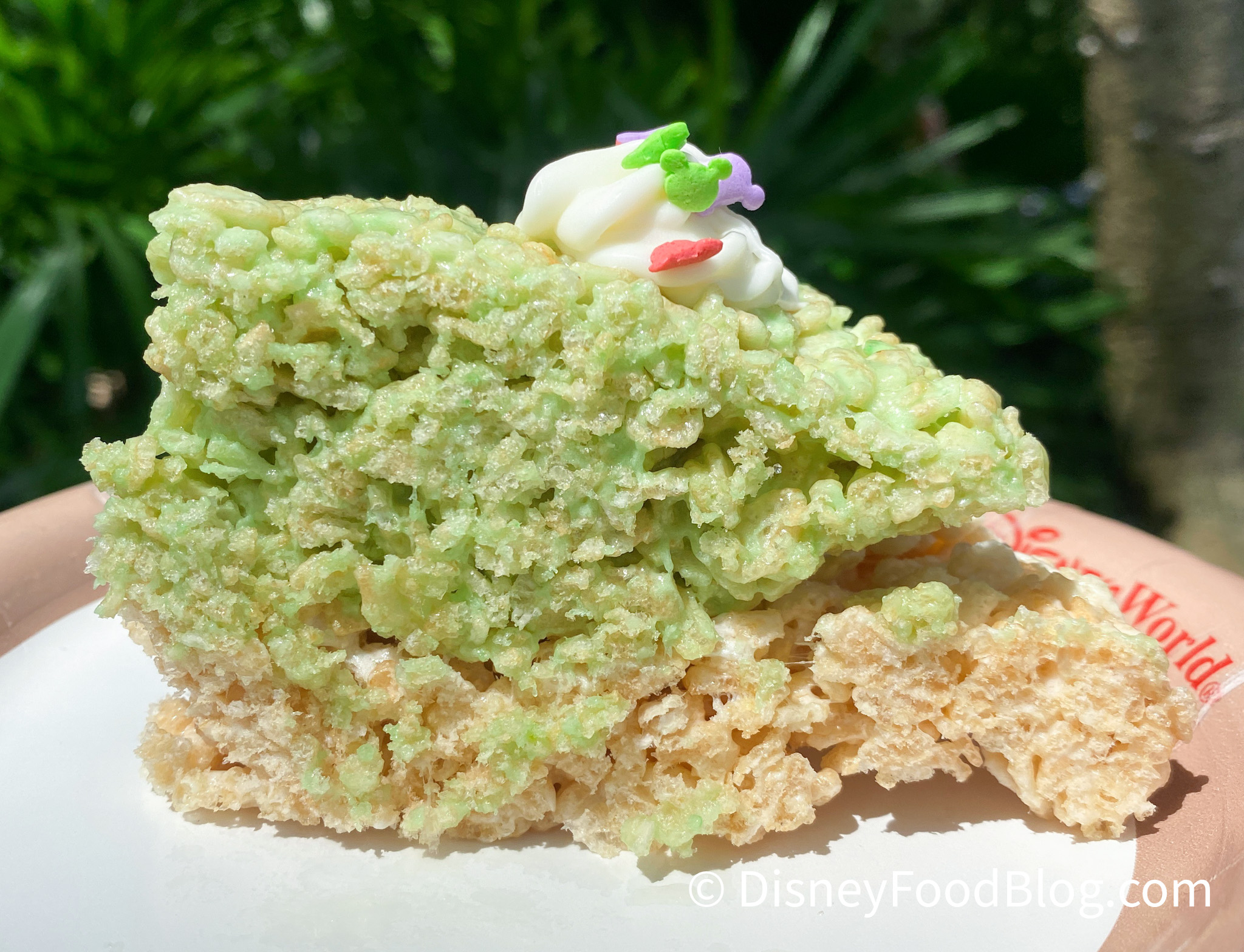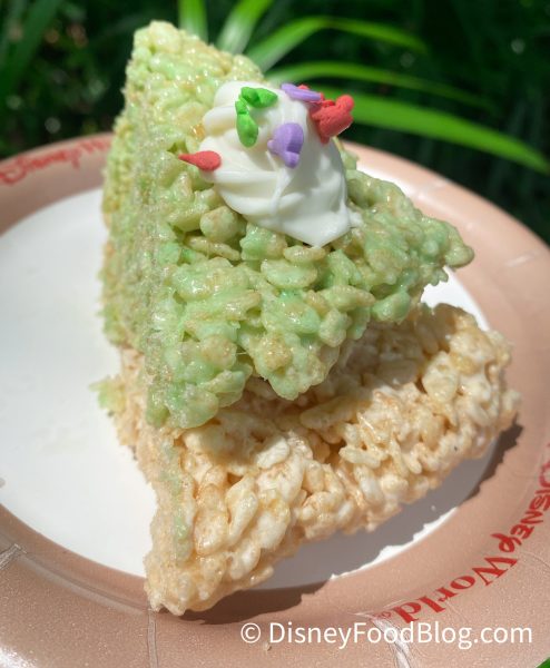 The Key Lime Pie Krispies Treat starts with your regular Krispies Treat pie “crust” base with a Key Lime Pie-flavored krispies treat center with a tiny dollop of icing on top and Mickey sprinkles!