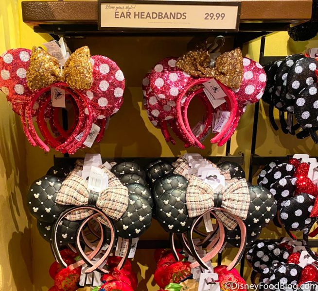 SURPRISE! The Tweed and Pearl Ears were BACK in stock! These are a gorgeous black pleather with little Mickey-shaped pearls, and they’re $29.99.