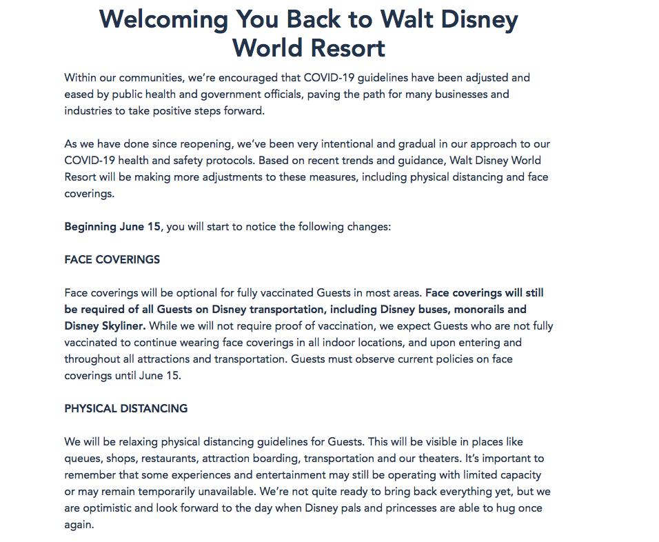 Keep in mind that these changes will NOT take place until June 15. Guests must continue to comply with Disney’s existing face mask policy until then.