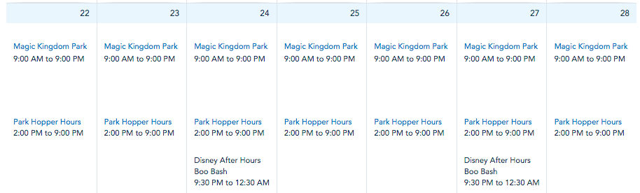 From August 22nd-28th, Magic Kingdom will be open from 9AM-9PM. Remember, the After Hours BOO Bash event is also taking place on August 24th and 27th, from 9:30PM-12:30AM. You’ll have to buy a separate ticket to attend.