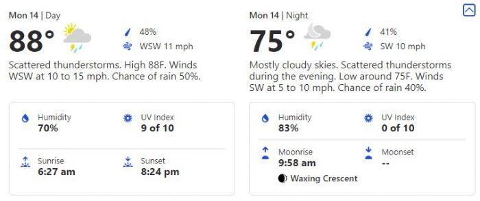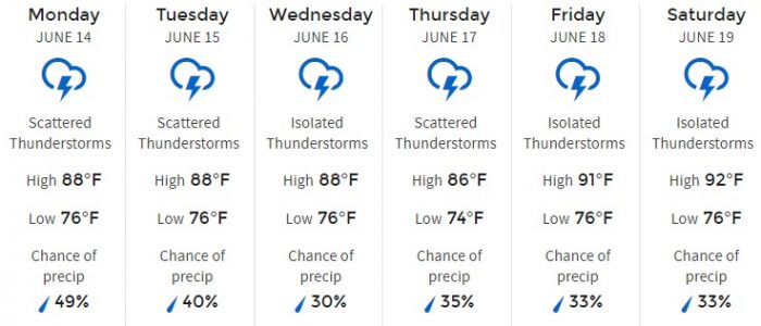 The next day, June 15th brings us a very similar forecast to the day before with a high of 88 degrees during the day and keeping that low down at a comfy 76 degrees.