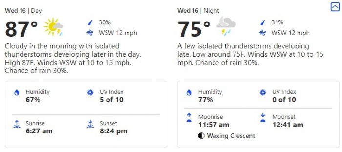 On Wednesday, June 16th, we’re going to see temps edge down just a little bit to 87 degrees during the day. Your low is going to edge down just a tad too.