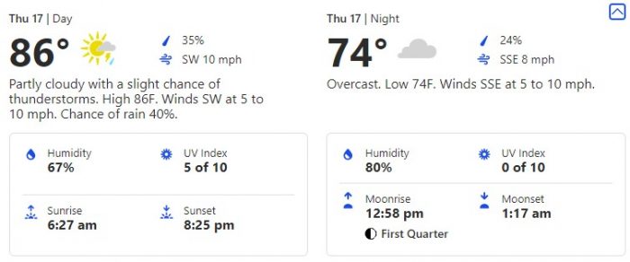 For Thursday, June 17th, we’re seeing a day with the LOWEST temps of the whole week in the mid-80s and a beautiful evening at 74 degrees.