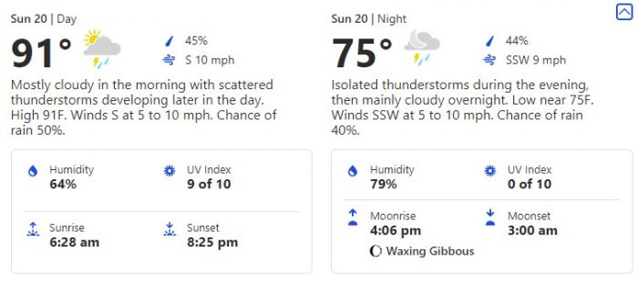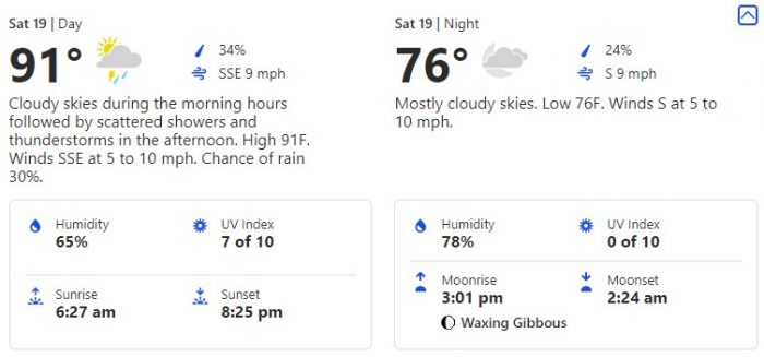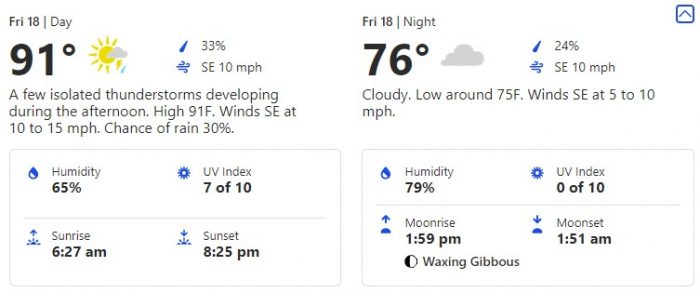 Here, we’ll see a 91-degree high and a 76-degree low.