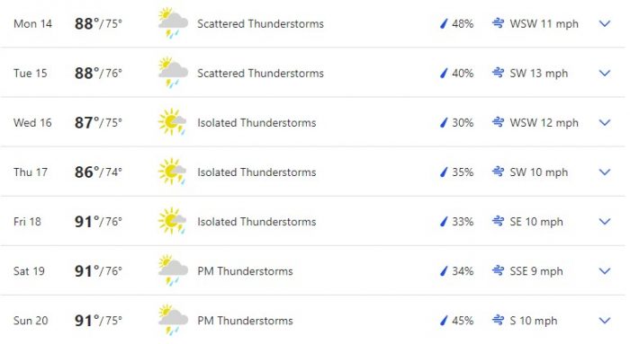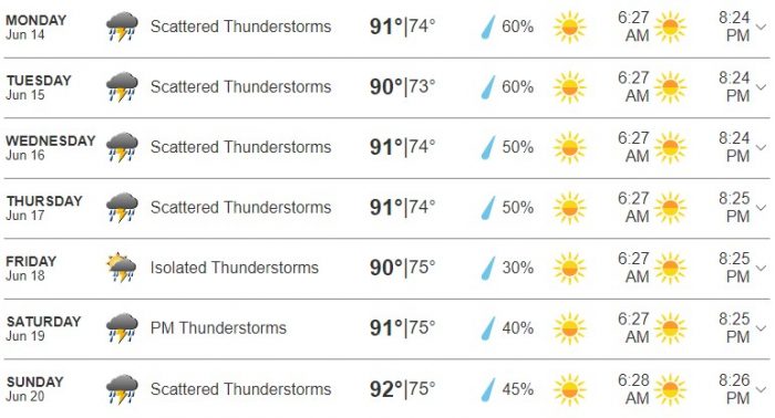 Here is a full overview of the week according to The Weather Channel. Temperatures are projected to hang out in about the same place for the whole week. We’re looking at a range of 80s to 90s highs and 70s lows.