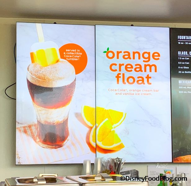 So color us intrigued when we popped over to Disney Springs and saw a sign for an Orange Cream Float at the Coca-Cola Store Rooftop Beverage Bar. Now we’ve had our share of Creamsicle-like treats recently, but this one is a little different. It’s made with Coca-Cola, Vanilla Ice Cream, and a whole Orange Cream Bar. Yes, you read that right — there’s a whole Creamsicle actually in it!