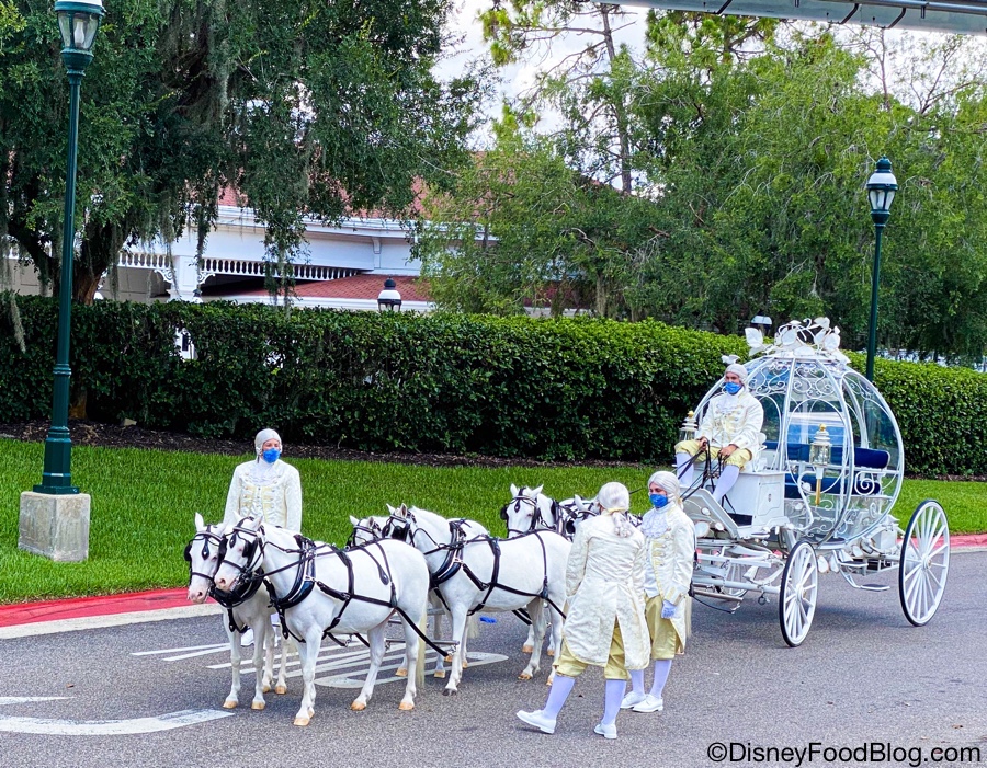 The whimsical, pumpkin-shaped carriage was sitting on the road in front of the resort, with six horses just chilling, and four Cast Members looking incredibly dapper in their regal wigs!