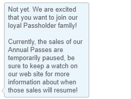 We are extremely upset about not being able to get Annual Passes, as I have been Passholders for 18 yrs. & my husband has been a passholder for at least 25+ years.