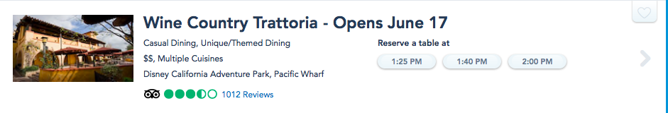 Next, you can grab reservations for lunch and dinner at Wine Country Trattoria also in Disney California Adventure Park.