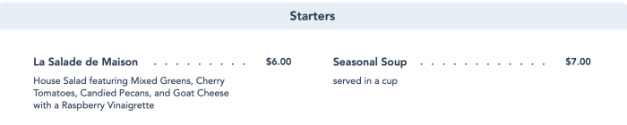 Moving on to appetizers, there’s only two options available, the La Salade de Maison for $6 and a cup of the Seasonal Soup for $7.