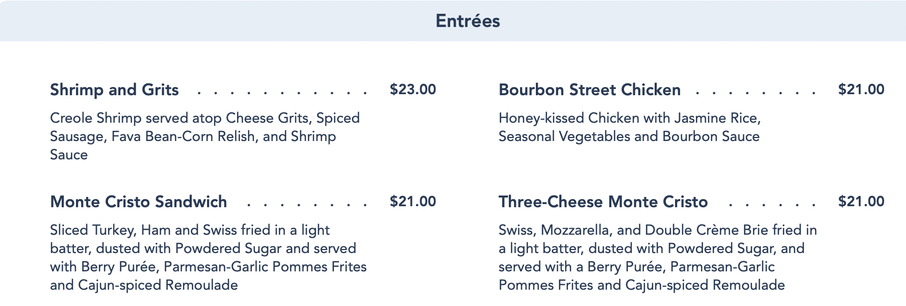 There are 4 entrees available: Shrimp and Grits for $23, the Bourbon Street Chicken for $21, the Monte Cristo Sandwich for $21, and the Three-Cheese Monte Cristo for $21.