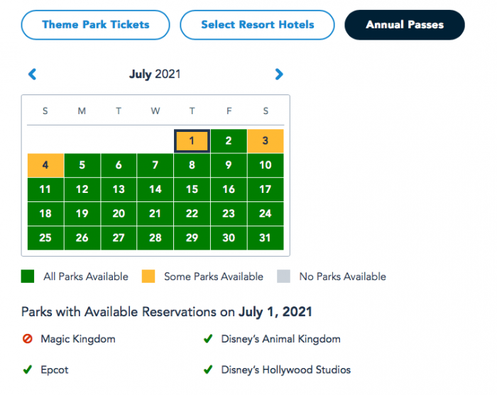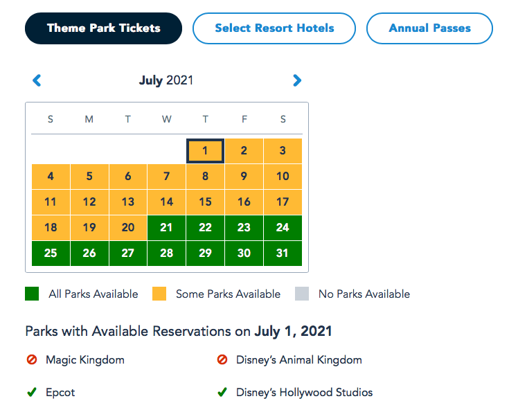 As a reminder, you are required to have a Park Pass reservation for the day and park you’re visiting, in addition to a valid ticket. And reservations for July 1st are already going FAST! Magic Kingdom is already completely full for Theme Park Ticket Guests…