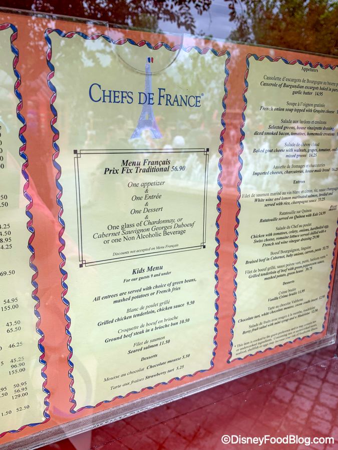 While in EPCOT, we saw some new menu pics up in the France pavilion because there have been price increases at a few of the restaurants! At Chefs de France, we saw several items go up slightly in price.