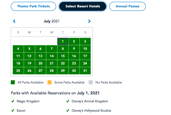 Now, both guests with theme park tickets and guests staying at select resort hotels have full availability for the entire month.