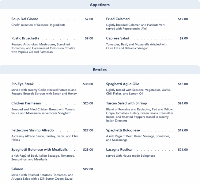 The menu features a small selection of appetizers and quite a few entree items including Spaghetti Bolognese with Meatballs, Rib-Eye Steak, and Spaghetti Aglio Olio.