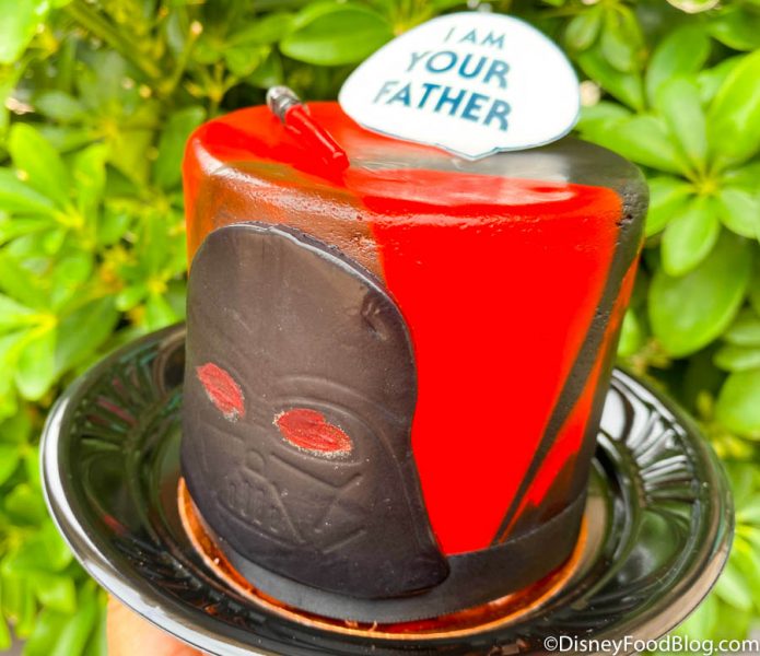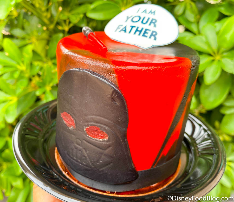 Now, we told you earlier today about a new Darth Vader cake for Father’s Day…and now we’re here to see how it tastes! The “I Am Your Father” Petit Cake is a red velvet cake with cream cheese filling, bourbon dark chocolate mousse, and white and dark chocolate crisp pearls. You’ll also get a lightsaber made of fondant, with a cocoa butter-covered handle!