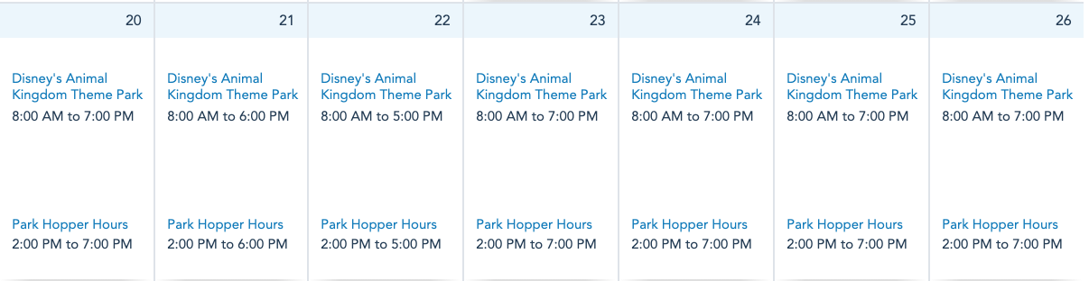 Finally, Disney’s Animal Kingdom actually has a bit of a unique schedule next week! The park will be open from 8AM-7PM on June 20th as well as the 23rd through the 26th. On Monday, June 21st, Animal Kingdom will close at 6PM, and on Tuesday, June 22nd, the park will close at 5PM.