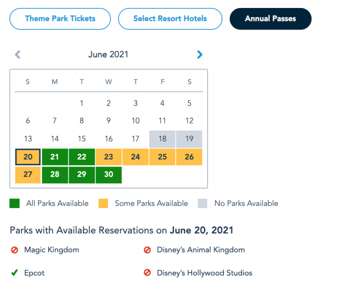 Annual Passholders have more day-to-day variation when it comes to Park Pass Reservations next week. Currently, Annual Passholders can book a Park Pass Reservation at EPCOT on Sunday, June 20th. Monday, June 21st and Tuesday, June 22nd are currently wide open for Annual Passholders!