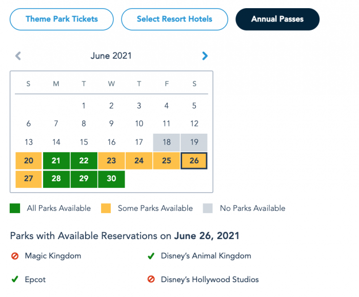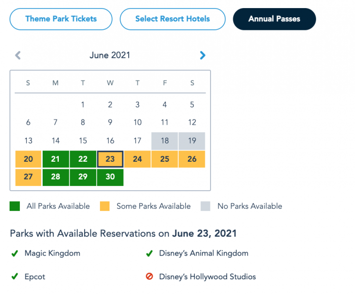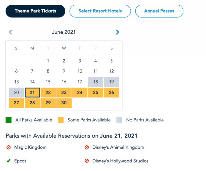 Park Pass Reservation availability for guests with Theme Park Tickets on June 21st as of June 18th © Disney