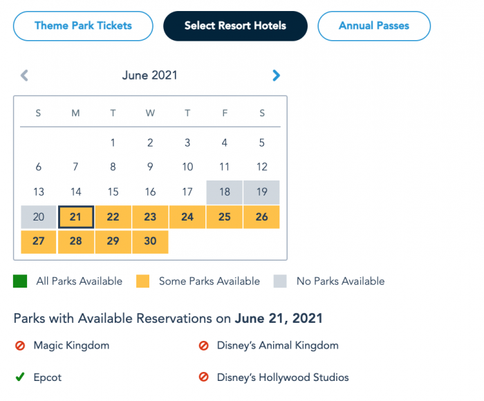 Park Pass Reservation availability for guests staying at Select Resort Hotels on June 21st as of June 18th © Disney