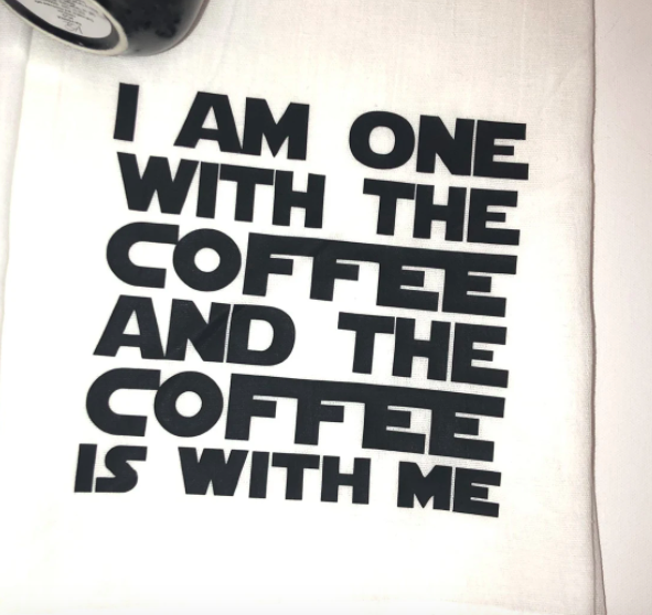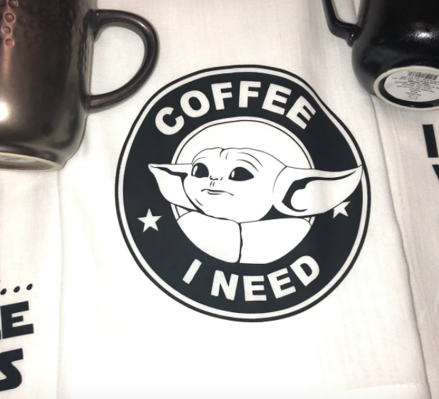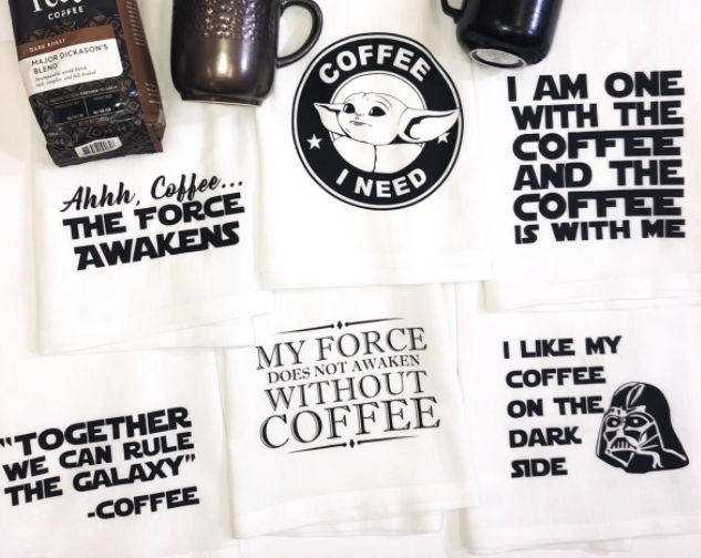 If you’re a coffee-loving Star Wars fan, these are definitely the kitchen towels for you! Each towel has a quote from the Star Wars movies…but with a slight twist!