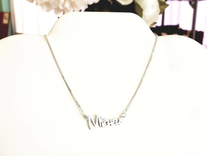 The necklaces are sterling silver with a box chain, which comes in 16″ or 18″. You can personalize with up to eight letters on the necklace, and the name adds about an inch (depending on how long the name is) to the length of the chain.
