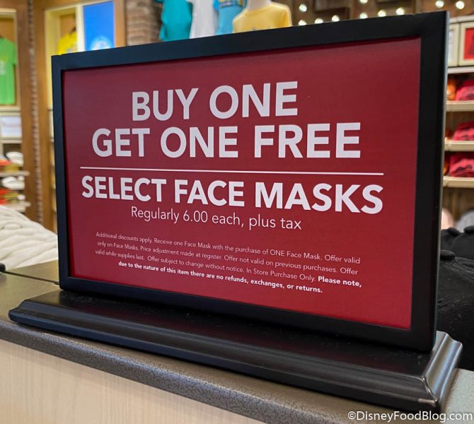 At World of Disney in Downtown Disney, we spotted that face masks are now buy one, get one free. As a reminder, the standard price for these masks is $6 each.