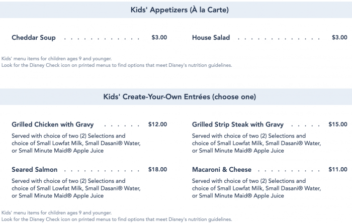 If you have kids dining with you, they can get their own appetizers! They have a choice between the Cheddar Soup for $3 or the House Salad for $3. For entrees, kids can chow down on things like the Grilled Strip Steak with Gravy for $15 or the Seared Salmon for $18.