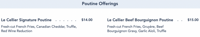 Canada is known for their poutine (AKA french fries drowned in gravy and cheese curds. AKA perfection!), so of course there’s some on the menu! You can get their Signature Poutine, which resembles the traditional version of poutine but also has TRUFFLE, for $14. (For a hot minute, this was an exclusive Passholder poutine before making it to the full menu!). There’s also the Le Cellier Beef Bourguignon Poutine for $15, which has Gruyere cheese and garlic aioli (oh yeah — and more truffle!).