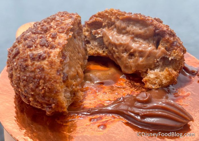 But the snack we found today is one we’ve had before — but it got dressed up for Father’s Day. We typically like the Hazelnut-Caramel Profiteroles from Le Petit Cafe at Disney’s Riviera Resort, but today, that snack got a special Father’s Day makeover. And y’all — not only is Disney STILL going hard on the mustache trend, but this snack is now wearing a top hat!
