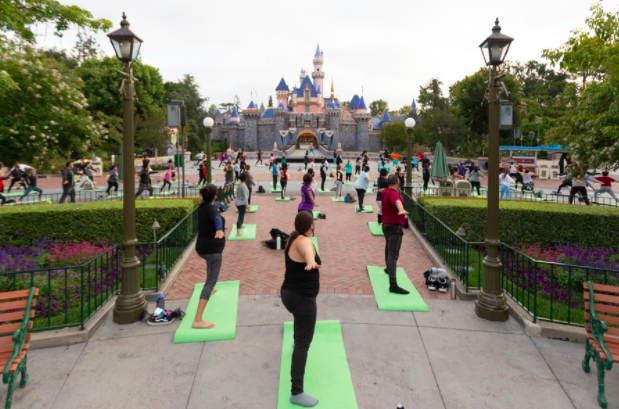 Across the sea in Disneyland, cast members gathered around the Sleeping Beauty castle for a yoga session!