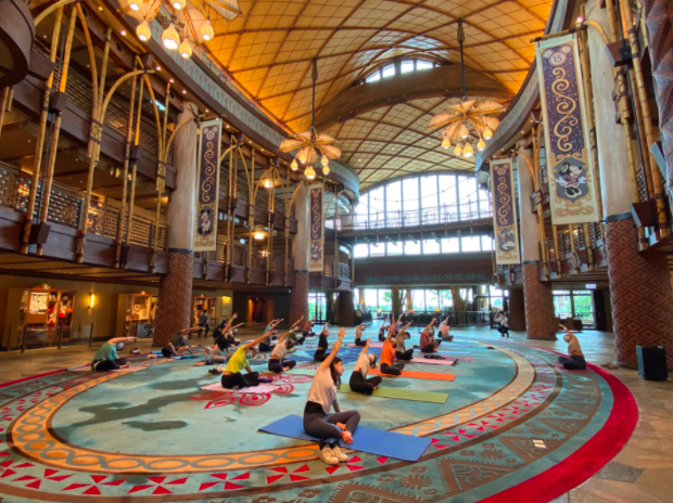 But that’s not the only place Disney Cast Members did yoga! Cast Members around the world in the Disney Parks took moments of mindfulness, making it a truly International Yoga Day. In the Hong Kong Disneyland Resort, you could find yogis in the Disney Explorers Lodge!