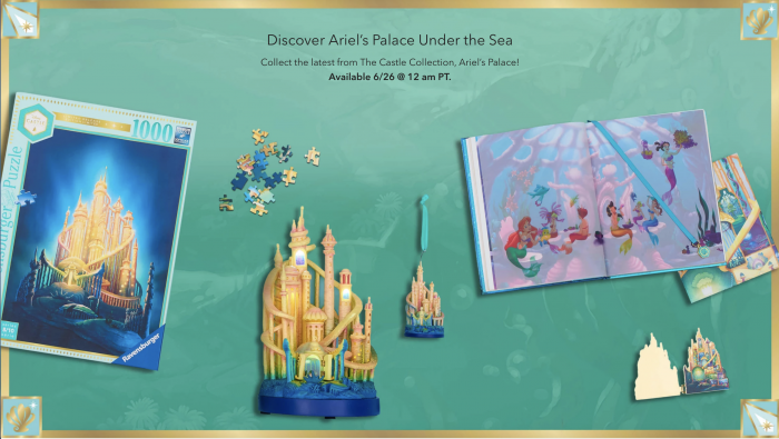 The Ariel’s Palace Under the Sea Collection will include a puzzle, the castle (of course), a castle ornament, a storybook, and a castle pin and will be available on shopDisney on June 26, 2021. Right now the time says 12AM PT…but we expect that will change to 12PM PT.