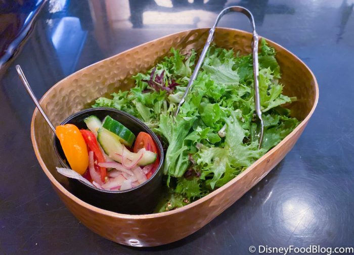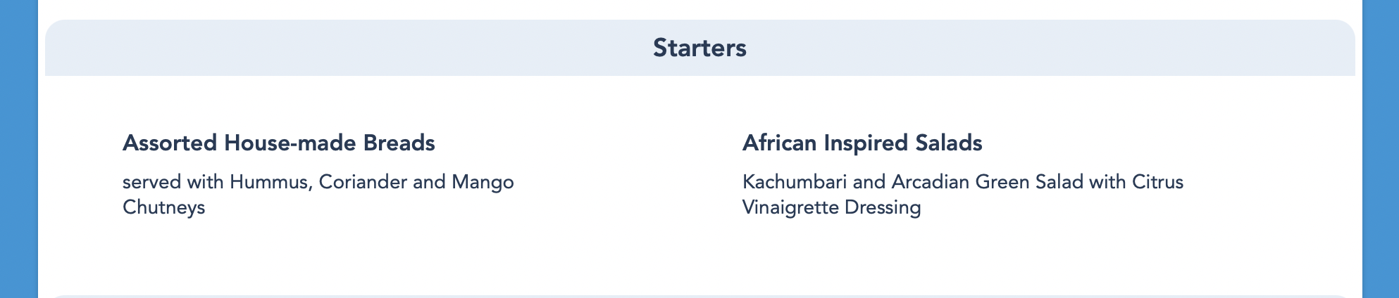 The food at Tusker House is inspired by African and Indian flavors and has A LOT of unique offerings as opposed to other Character Dining experiences in Disney World. Lunch and Dinner are $55 for adults and $36 for kids — the same price as dinner currently at the Contemporary’s Chef Mickey’s (probably the most comperable character meal offered at this time). The starters for this menu are compromised of a delicious bread service and an African-inspired salad with a citrus vinaigrette dressing.