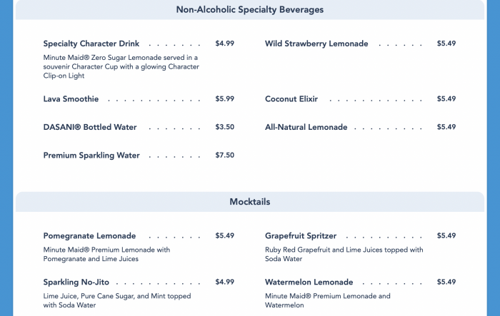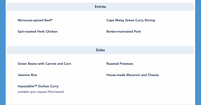 If you’re looking for allergy-friendly or plant-based options, be sure to speak with a Cast Member. We noted some of the plant-based items above but below is a full look at the allergy-friendly menu we were provided.