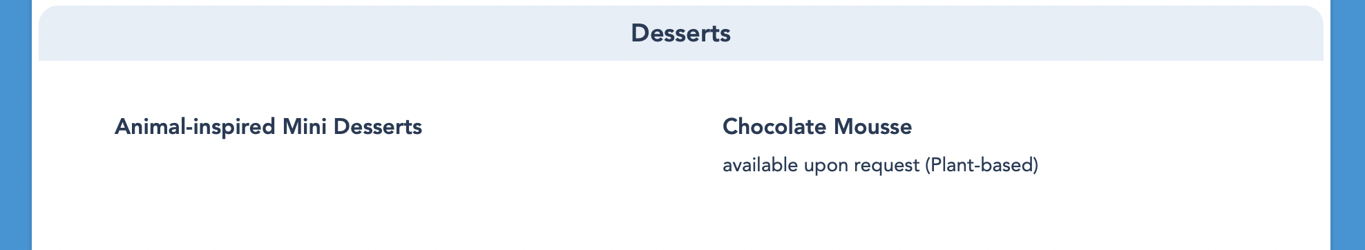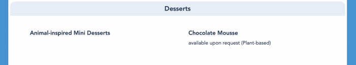For the main entrees, a plant-based Impossible Durban Curry is available upon request. Again, for dessert, you can ask for a plant-based chocolate mousse.