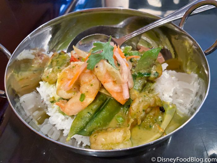 Now the highlight of our entrees, the Cape Malay Green Curry Shrimp with Jasmine Rice. This dish was not quite as spicy as the other curry that we had during breakfast but it had TONS OF FLAVOR. The shrimp in this dish were massive and juicy and the dish as a whole was very unique compared to other items we have gotten at Disney World. We could definitely eat seconds of this!!