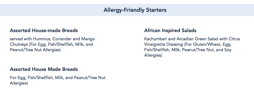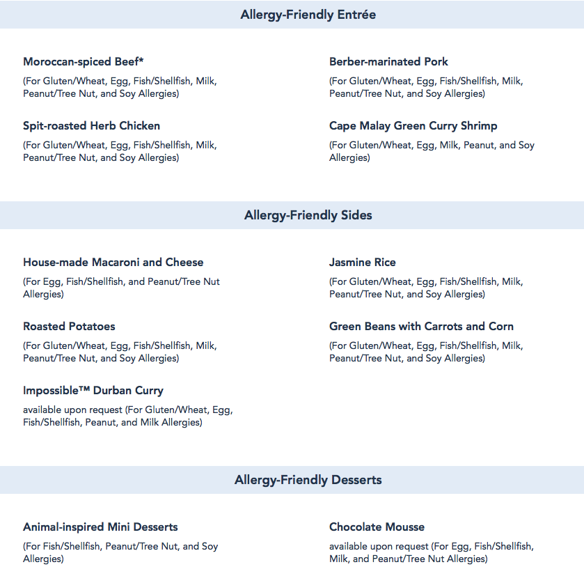 Here’s a look at those Allergy-Friendly options from Disney’s online menu.