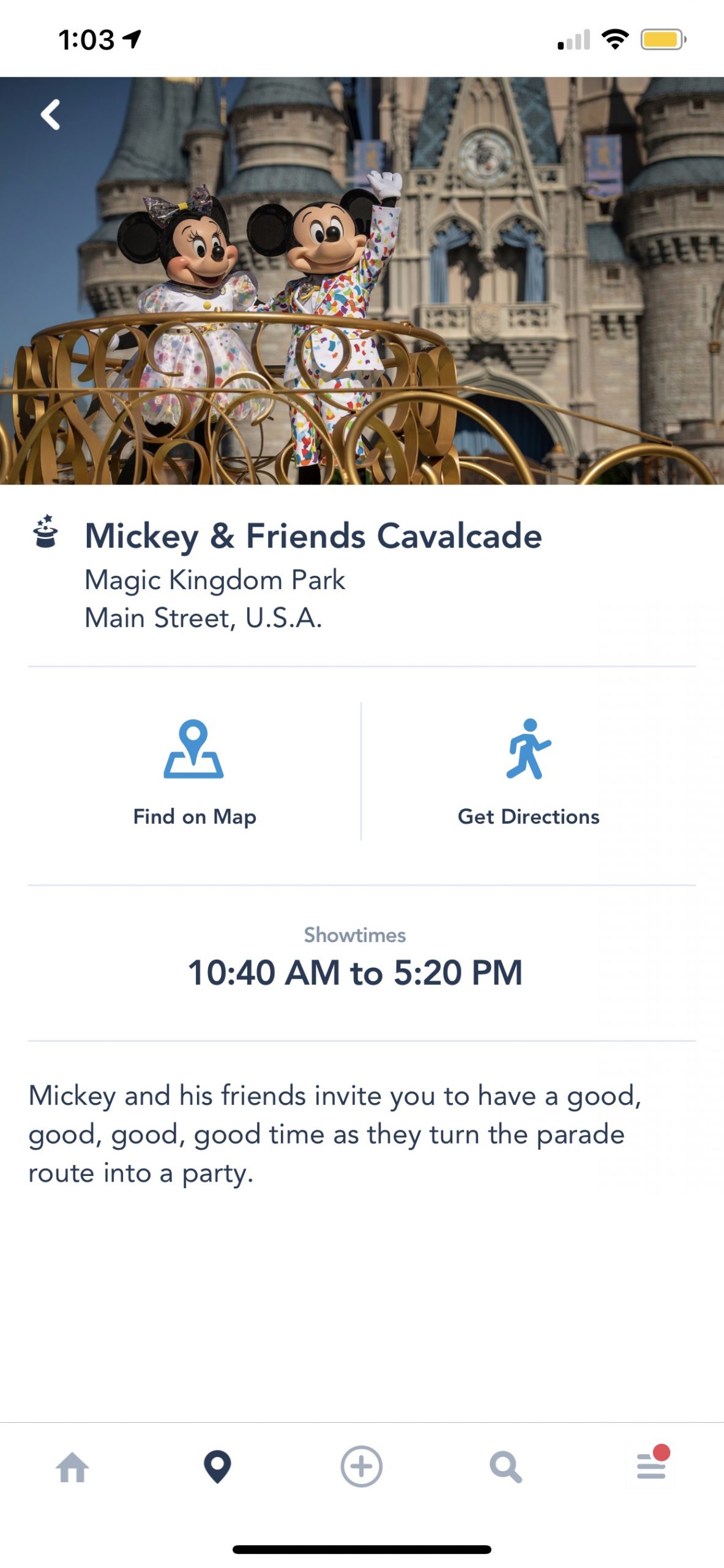 On My Disney Experience, you can also see the Disney Cavalcade showtimes. This is taking place daily at 10:40AM to 5:20PM. For a long time, these performances did not have set times, to avoid crowding. Yesterday, Disney announced a new Mickey and Friends cavalcade for the 50th as well.