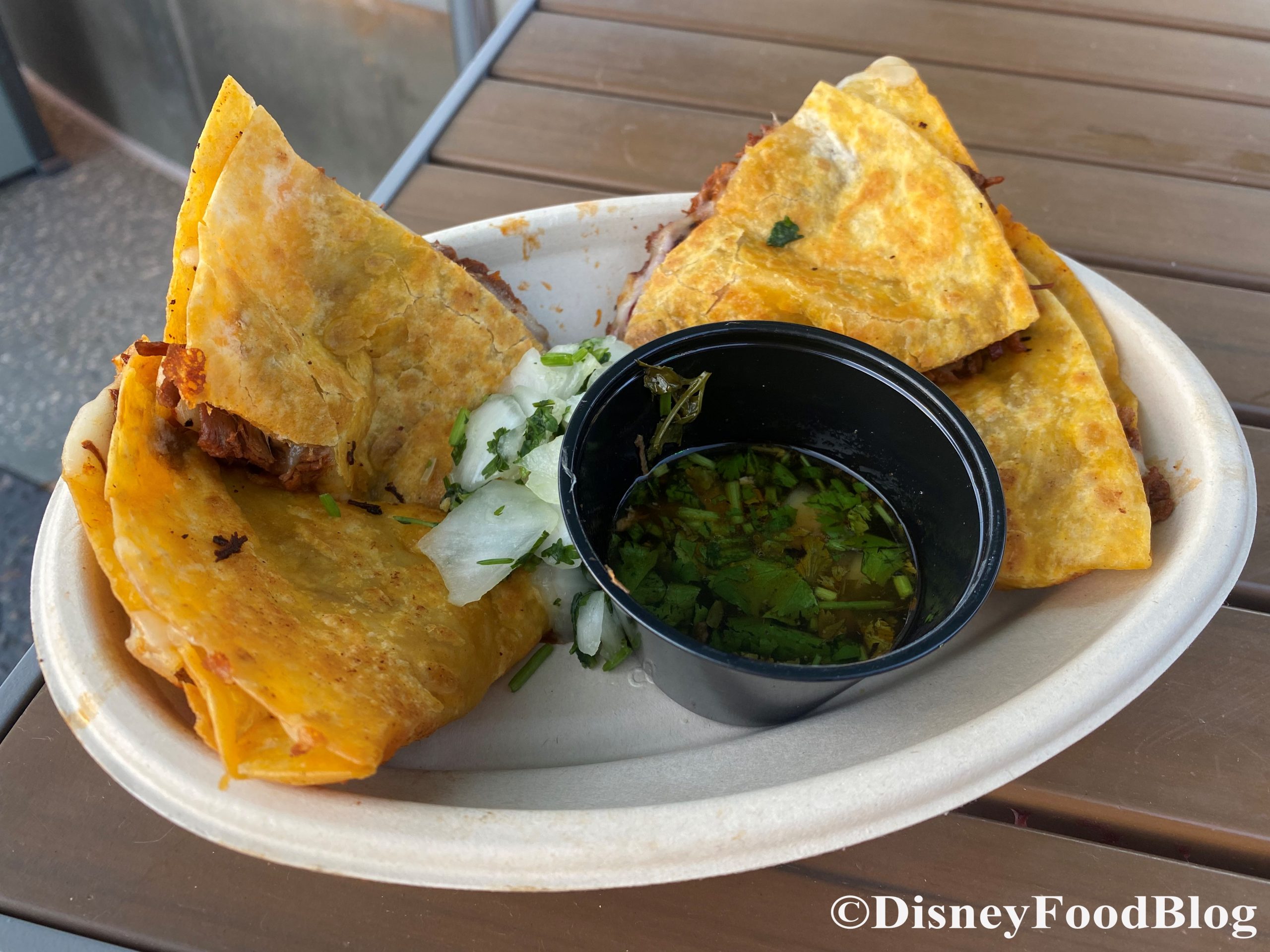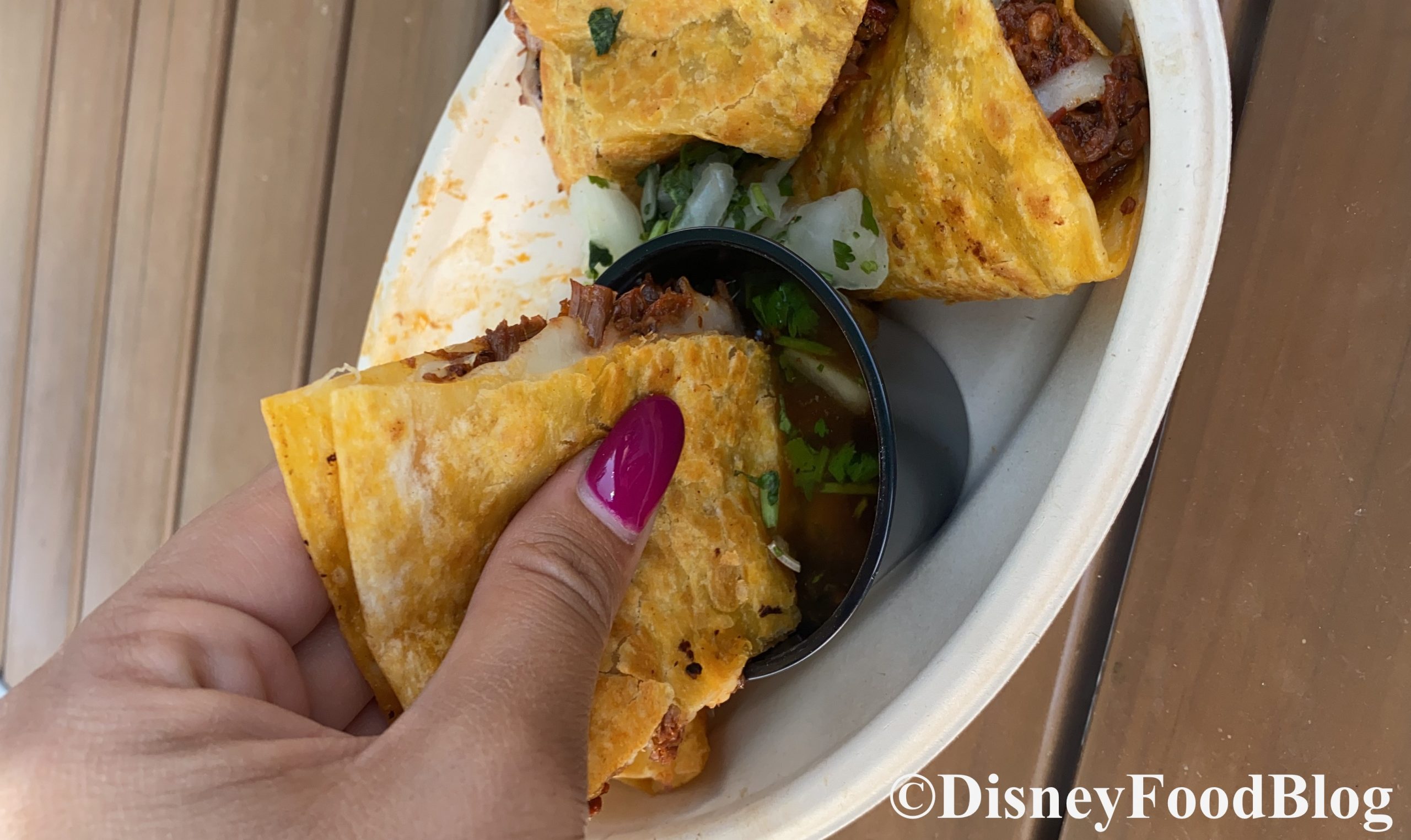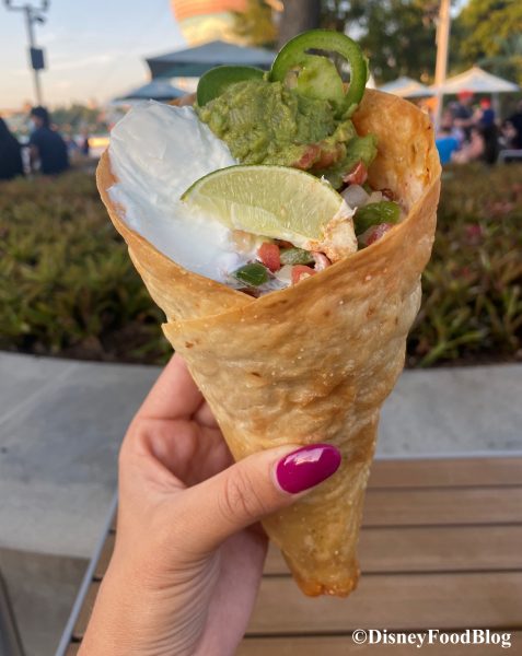 We chose the chicken filling based on a Cast Member’s recommendation; they said it had a little more heat and was more flavorful than the pork. So, of course, we had to give it a try!