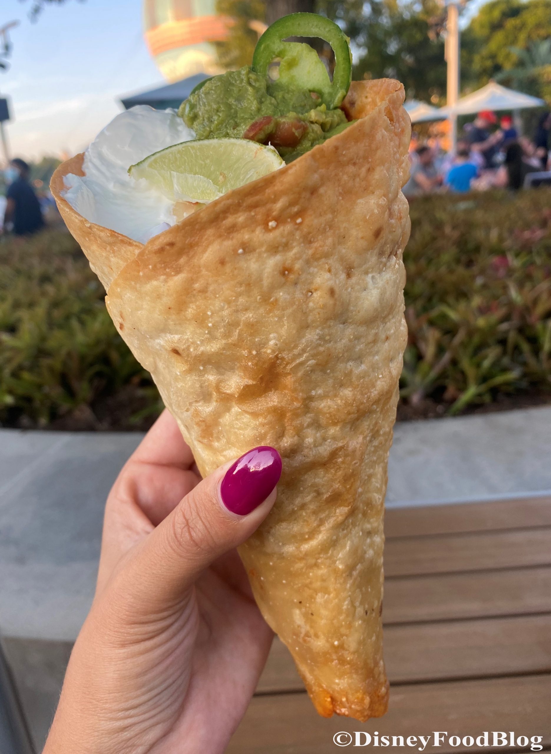 It comes with your choice of filling (protein or plant-based), shredded lettuce, guac, sour cream, pico de gallo, queso (queso!!!!!!), cilantro, jalapeno, and a lime wedge all served in a big, crispy tortilla cone for $11.99.