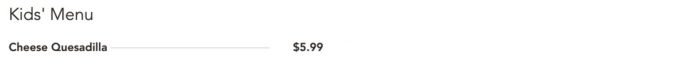 - You’re looking for a Kid’s Menu with more variety. It’s a cheese quesadilla only here, kiddos!