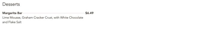 But the dessert option sounds DELISH — A Margarita Bar with lime mousse, graham cracker crust, white chocolate, and flake salt — all for $6.49. YUM.